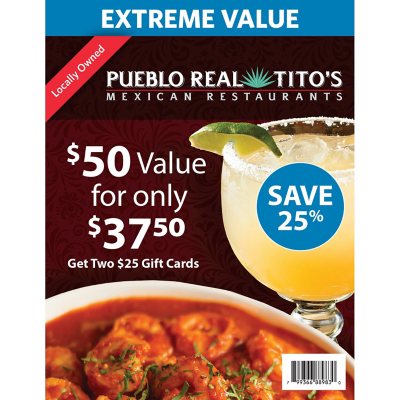 Pueblo Real Tito S Mexican Restaurant 50 Value Gift Cards 2 X 25 Sam S Club
